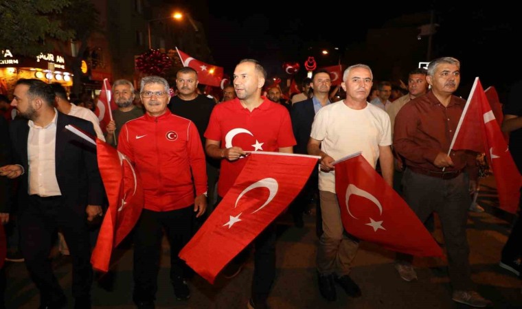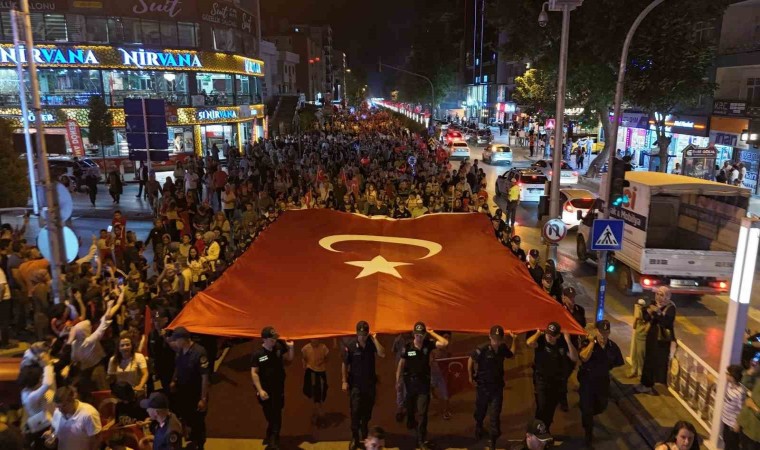 Derbent Kavşağı’nda bir araya gelen protokol üyeleri ile vatandaşlar, ellerindeki Türk bayrakları ve meşalelerle Cumhuriyet Meydanı’na yürüdü.