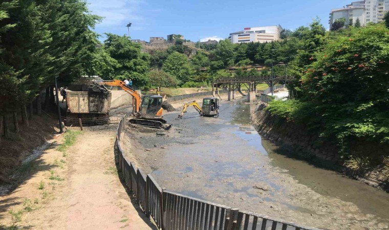Trabzon Büyükşehir Belediyesi ekipleri Zağnos Vadisi’ndeki dere yatağını balçıktan temizliyor.