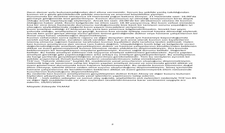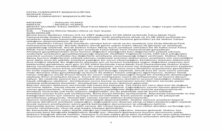 Kızlarını kaybeden acılı aile, operasyonu gerçekleştiren genel cerrahi uzmanı ve hastane yönetiminden, ‘taksirle ölüme neden olma ve sair suçlar’ gerekçesiyle şikayetçi oldu. Anne Zübeyde Yılmaz tarafından mahkemeye sunulan şikayet dilekçesinde, “Ameliyat gerçekleşmeden önce kızımın değerleri alındığında bazı değerlerinin yüksek çıkması nedeniyle ameliyatın gerçekleşmeyeceği söylendi. Özellikle trigliserid: 1.123, CRP:16,5 çıktığından anestezi uzmanı tarafından bu değerlerle ameliyata alınamayacağı bilgisi verilmişti. Doktor Erkan Aksoy kızımın değerlerinin yüksek çıkması nedeniyle anestezi doktorunun ameliyata izin vermediğini ama daha önce bu şekilde ameliyat yaptığını bir sorun oluşmadığını, kendisinin anestezi doktorunu ikna ettiğini söyledi. Bu değerlerin düşmesi için ve kızımın ameliyata uygun değerlere ulaşması için beklenmesi gerekirken, aynı gün 27 Mayıs 2024 tarihinde Fatsa Medi-Tech Hastanesinde Doktor Erkan Aksoy tarafından ameliyat edilmiştir. Bu ameliyattan sonra kızım hiç iyileşemedi ve hayatını kaybetti” ifadelerine yer verdi.