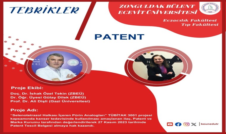ZBEÜ Eczacılık Fakültesi öğretim üyesi Dr. Öğr. Üyesi Gülay Dilek, Tıp Fakültesi öğretim üyesi Doç. Dr. İshak Özel Tekin ile Gazi Üniversitesi Fen Fakültesi öğretim üyesi Prof. Dr. Ali Dişli’nin birlikte geliştirdikleri “Selenotetrazol Halkası İçeren Pürin Analogları” TÜBİTAK 3001 projesi kapsamında kanser tedavisinde kullanılması amaçlanan ilaç, ZBEÜ Teknoloji Transfer Ofisi Koordinatörlüğünün başvurusu neticesinde Türk Patent ve Marka Kurumu tarafından değerlendirilerek Patent Tescil Belgesi almaya hak kazandı.