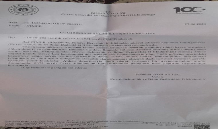 Bursa’nın Karacabey ilçesine bağlı Ekmekçiler Mahallesi’nde yaşayan İlhan Düzen, Nilüfer Çayı’nın kirliği konusunda CİMER’e şikayette bulundu. Düzen’e kısa sürede cevap veren Bursa Çevre Şehircilik ve İklim Değişikliği İl Müdürlüğü, Nilüfer Çayı’nda inceleme başlatıldığını ve henüz herhangi bir atık su deşarjı tespit edilemediğini açıkladı. Çevre Şehircilik ve İklim Değişikliği İl Müdürlüğü tarafından CİMER şikayetine verilen cevapta, “İlgili CİMER şikayetinde Nilüfer Deresi’nin kirliliğinden şikayet edilerek, konunun valiliğimizce (Çevre Şehircilik ve İlklim Değişikliği İl Müdürlüğü) incelenmesi istenmiştir. Söz konusu şikayete istinaden teknik elemanlarımızca denetim yapılmış olup, dereye atık su deşarjı gözlenmemiştir. Bununla birlikte ilimizde bulunan derelere arıtılmış atık su deşarj eden arıtma tesisleri, valiliğimizden (Çevre Şehircilik ve İlklim Değişikliği İl Müdürlüğü) alınmış atık su deşarjı konulu çevre izni kapsamında ani denetimlerle denetlenmekte olup, günde 5 bin metreküp üzerindeki kapasiteye sahip büyük arıtma tesislerinin deşarj suları online olarak bakanlığımız portalından izlenmekte ve limit aşımı olduğunda otomatik olarak numune alınarak ilgili mevzuat uyarınca gerekli işlemler yürütülmektedir. Atık su deşarjıyla ilgili olarak herhangi bir uygunsuzluğun tespiti durumunda 2872 sayılı Çevre Kanunu’nun ilgili hükümleri gereğince idari yaptırım uygulandığı hususunda bilgilerinizi ve gereğini arz ederim” ifadelerine yer verildi.
