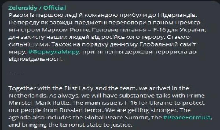 Resmi Telegram hesabından açıklama yapan Zelenski, “First Lady ve ekibimizle birlikte Hollanda'ya vardık. Her zaman olduğu gibi Başbakan Mark Rutte ile önemli görüşmeler gerçekleştireceğiz. Ana konu, halkımızı Rus teröründen korumak için Ukrayna'ya F-16 verilmesi. Giderek güçleniyoruz. Gündemimizde ayrıca Küresel Barış Zirvesi, Barış Formülü ve terörist devletin adalete teslim edilmesi de var” dedi.