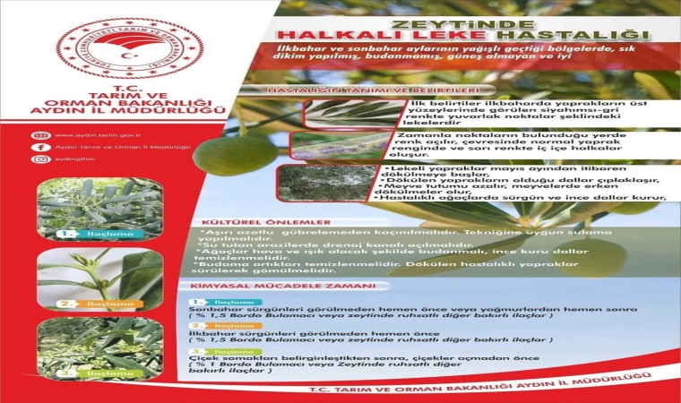 Konu ile ilgili Söke İlçe Tarım ve Orman Müdürlüğü’nden yapılan açıklamada “Zeytin üreticilerimizin dikkatine, Zeytin’de Halkalı Leke riski yüksek seviyeye ulaşmıştır. Hasadı tamamlanan zeytinliklerde ruhsatlı ilaçlar ile en kısa sürede koruyucu ilaçlama yapılması gerekmektedir” ifadeleri yer aldı.