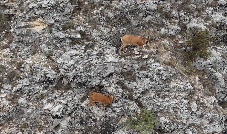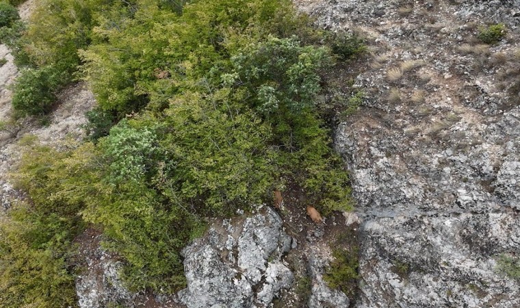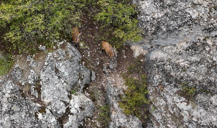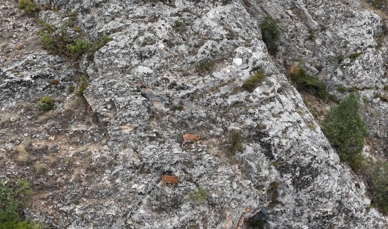 Reşadiye ilçesine bağlı Yolüstü köyü sınırları içerisinde yer alan Zinav Gölü ve kanyonu, doğaseverler ile turistlerin ilgisini çekmeye devam ediyor. Özellikle doğa sporları tutkunlarının uğrak noktası olan yaklaşık 3 kilometrelik akarsuya sahip kanyonun bazı bölgelerinde su derinliği yer yer 3 metreye kadar ulaşıyor. Bölgedeki doğa harikası manzaralar, macera arayanların ilgisini çekiyor. Erbaa ilçesinde yaşayan Umut Bekol, arkadaşları ile birlikte kanyon gezisi sırasında heyecan verici anlara tanıklık etti. Zinav Kanyonu’nda ilerlerken, kayalıkların arasından akan suda yürüyen Bekol, üzerlerine kaya parçalarının düşmekte olduğunu fark etti. Toprak kayması olabileceğini düşünen Bekol, güvenli bir şekilde geri çıkarak dronu ile kanyonun yukarısından görüntüler almaya başladı. Dron ile yaptığı çekimlerde, iki dağ keçisini fark eden Bekol, heyecanla dronunu keçilere doğru yönlendirdi. Keçiler, bir süre drona bakarak duraksasa da pervane sesinden ürkerek ağaçlık alana doğru hızla uzaklaştı. Bekol, bu anları dron kamerası ile saniye saniye kaydederek bölgedeki doğal yaşamın güzelliklerine dikkat çekti.