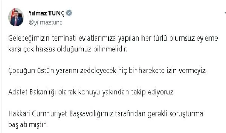 Adalet Bakanı Yılmaz Tunç da konuyla ilgili sosyal medya hesabından açıklama yaptı. Bakan Tunç, "Geleceğimizin teminatı evlatlarımıza yapılan her türlü olumsuz eyleme karşı çok hassas olduğumuz bilinmelidir. Çocuğun üstün yararını zedeleyecek hiçbir harekete izin vermeyiz. Adalet Bakanlığı olarak konuyu yakından takip ediyoruz. Hakkari Cumhuriyet Başsavcılığımız tarafından gerekli soruşturma başlatılmıştır" dedi. (DHA)