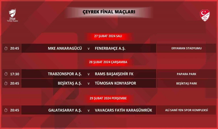 Ziraat Türkiye Kupası çeyrek final maçlarının programı, Türkiye Futbol Federasyonu (TFF) tarafından duyuruldu. 27, 28 ve 29 Şubat tarihlerinde oynanacak çeyrek final mücadelelerinin programı şöyle: