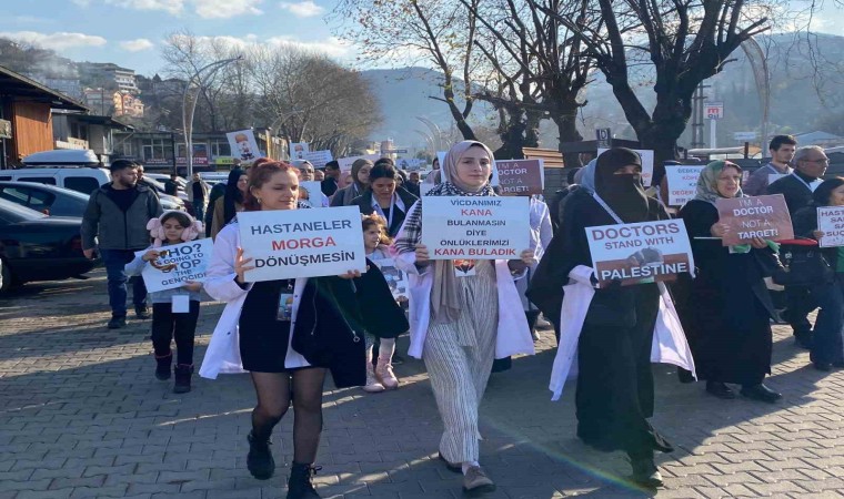 Zonguldak’ta doktorlar İsrail’in Filistin saldırılarına tepki göstermek amacıyla kanlı önlüklerle yürüyüş yaptı.