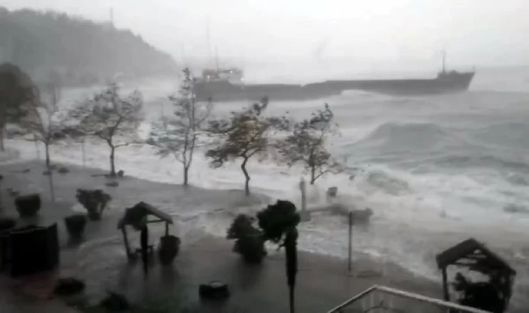 Zonguldak'ın Ereğli ilçesinde fırtına nedeniyle sürüklenen yük gemisi, karaya oturdu. Sahil Güvenlik Komutanlığı'na bağlı ekipler, geminin kaptanı ile iletişim kurdu. Gemide kaç mürettebat olduğu öğrenilemezken, bölgede kurtarma çalışması başlatıldı. Geminin, metrelerce yükselen dalgalar ile sürüklendiği anlar ise cep telefonu kamerasıyla görüntülendi. (DHA)