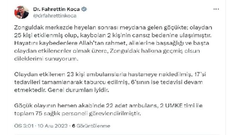 Sağlık Bakanı Fahrettin Koca, Zonguldak'taki heyelana ilişkin sosyal medya hesabından açıklama yaptı. Koca, "Zonguldak merkezde heyelan sonrası meydana gelen göçükte; olaydan 25 kişi etkilenmiş olup, kaybolan 2 kişinin cansız bedenine ulaşılmıştır. Hayatını kaybedenlere Allah'tan rahmet, ailelerine başsağlığı ve başta olaydan etkilenenler olmak üzere, Zonguldak halkına geçmiş olsun dileklerimi sunuyorum. Olaydan etkilenen 23 kişi ambulanslarla hastaneye nakledilmiş, 17'si tedavileri tamamlanarak taburcu edilmiş, 6'sının ise tedavisi devam etmektedir. Genel durumları iyidir. Göçük olayının hemen akabinde 22 adet ambulans, 2 UMKE timi ile toplam 75 sağlık personeli görevlendirilmiştir" dedi. (DHA)