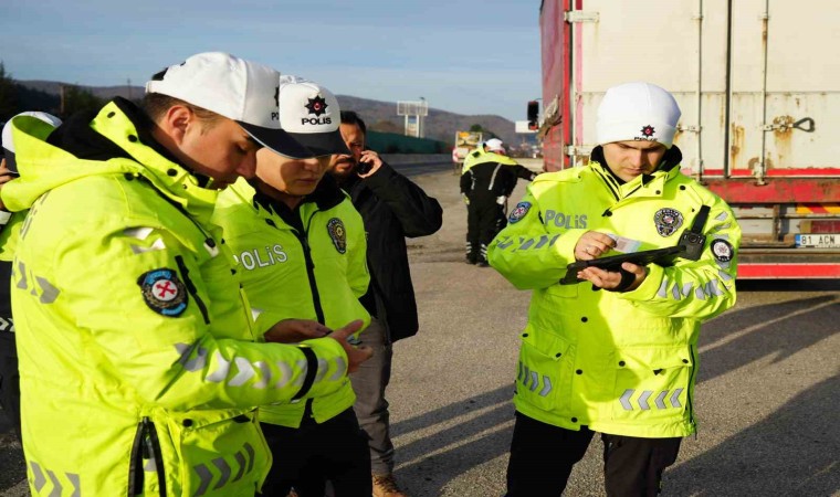 Kış lastiği takma zorunluluğu uygulamasının başlamasıyla birlikte Bolu’da şehirlerarası yük ve yolcu taşıyan ticari araçlar, polis ekipleri tarafından tek tek kontrol edildi.